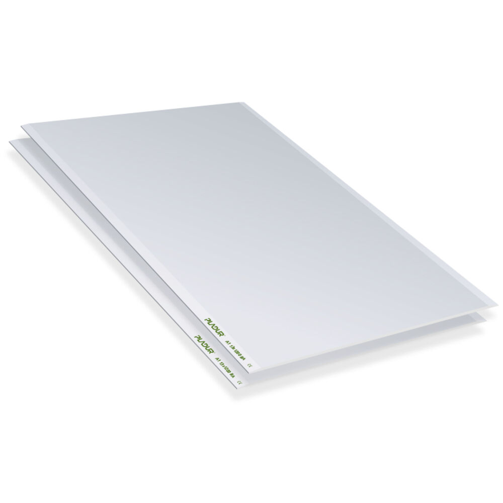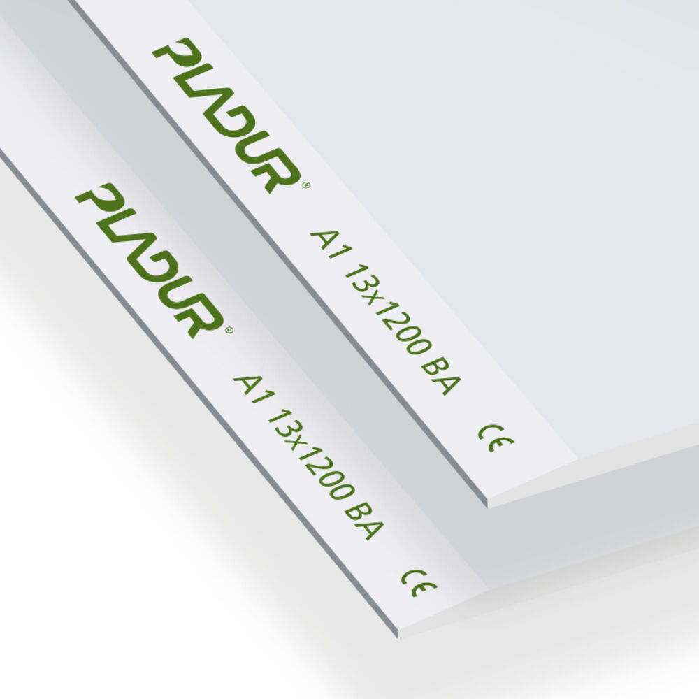 Laminated plasterboard consisting of a 100% natural gypsum core tightly bonded to two cellulose sheets. Board consisting of a 100% natural gypsum and fibreglass core, coated on both sides with a continuous fibreglass mesh film. This special composition gives it A1 fire rating, thus providing better resistance. It is identifiable by its white front. It has a nominal thickness of 13 mm, with a nominal width of 1200 mm. The long edges of the board are cardboard-coated and tapered (BA).
