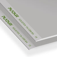 Laminated plasterboard consisting of a 100% natural gypsum core tightly bonded to two cellulose sheets. The board characteristics give it type I, D, E, F, R, H1 classification as per standard EN-520:2004 +A1 2009. The core of this board is made of very high density gypsum plaster (D) and reinforced with fibreglass (F). The PladurĀ® SOLIDTEX board is damp resistant (H1), classified as high hardness (I), with enhanced mechanical resistance properties (R), all in grey. It is used in applications that require greater surface hardness, high breaking strength and greater load-bearing capacity.. It has a total nominal thickness of 13 mm, with a nominal width of 1200 mm. The long edges of the board are cardboard-coated and tapered (BA).