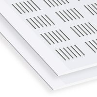 Laminated plasterboard for ceilings consisting of a 100% natural gypsum core tightly bonded to two cellulose sheets. The board is perforated with 5 x 80-mm rectangular holes. It has a total nominal thickness of 13 mm, a nominal width of 1200 mm and a nominal length of 2400 mm. The long edges of the board are cardboard-coated and tapered (BA).