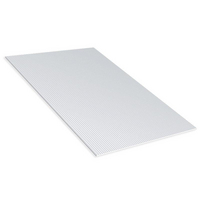 Laminated plasterboard for ceilings consisting of a 100% natural gypsum core tightly bonded to two cellulose sheets. This board is perforated with Ø 6-mm round holes every 18.75 mm distributed evenly over the board. It has a total nominal thickness of 13 mm, a nominal width of 1200 mm and a nominal length of 2400 mm. The board has cut and bevelled short and long edges (VE).