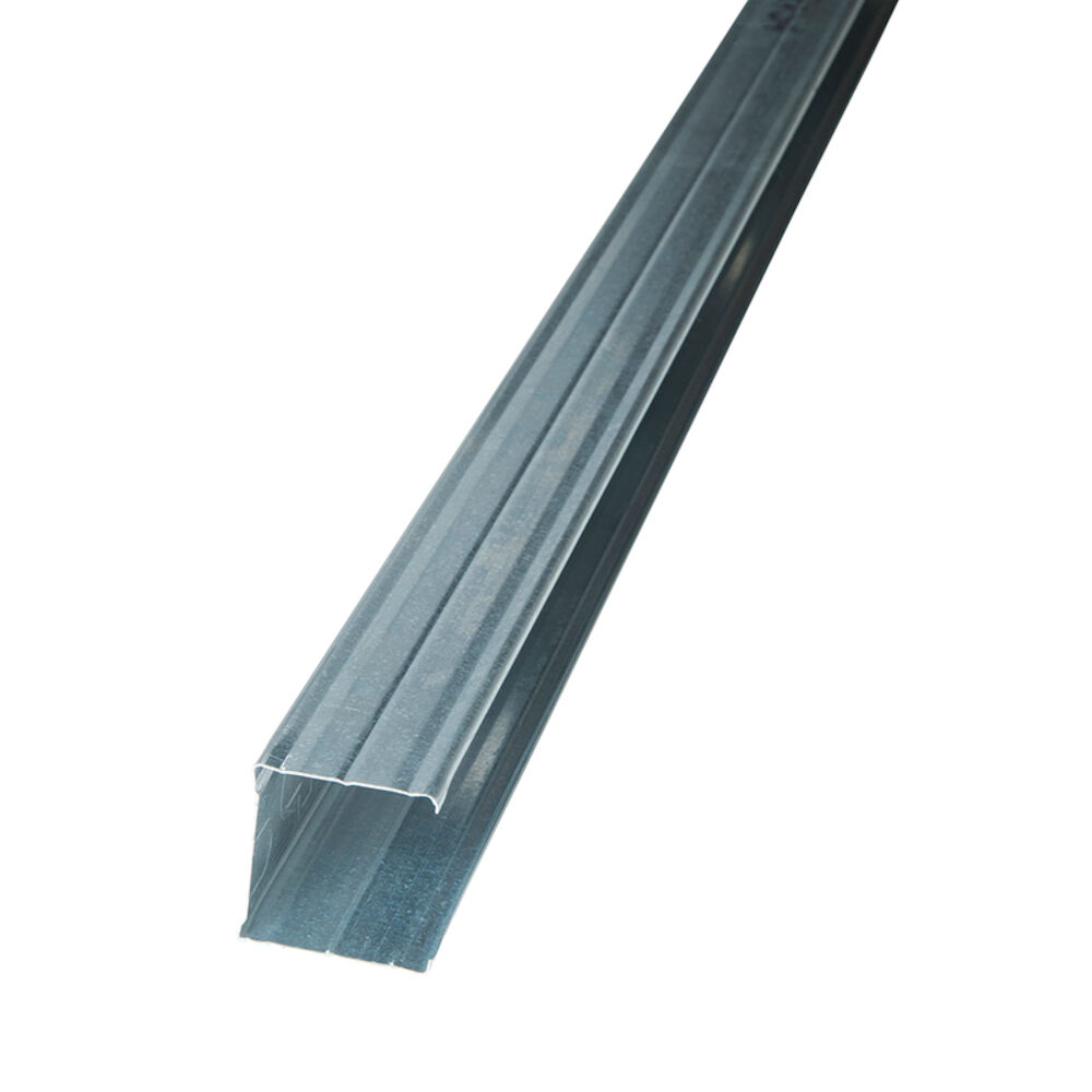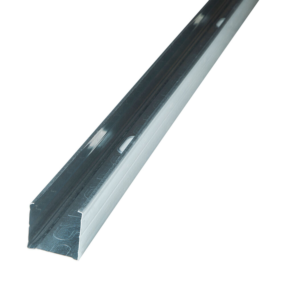 Cold rolled steel parts for use in construction work, together with laminated plasterboard and gypsum board products where the frame is not load-bearing. C-shaped profile, used as a load-bearing element for cladding panels, partitions and ceilings. The core is perforated for inserting installations through it. It has a nominal width of 48 mm, with wings measuring 45 mm. It is made of 0.62 mm thick Z140 galvanised steel plate.