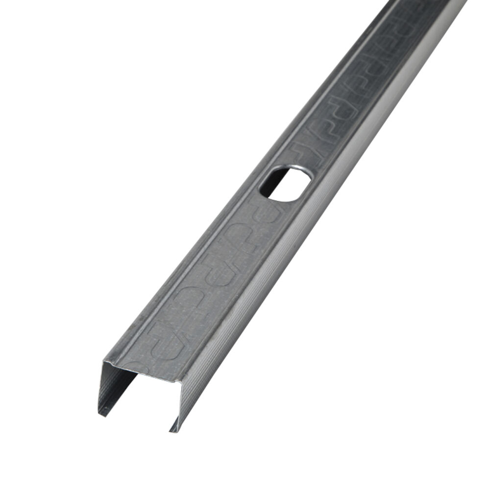 Cold rolled steel parts for use in construction work, together with laminated plasterboard and gypsum board products where the frame is not load-bearing. C-shaped profile, used as a load-bearing element for cladding panels, partitions and ceilings. The core is perforated for inserting installations through it. It has a nominal width of 46,5 mm, with wings measuring 35 mm. It is made of 0.6-mm thick Z140 galvanised steel plate.
