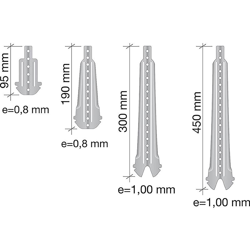 Flat hanger clips of different lengths, pre-marked for screwing or nailing onto wooden joists or the soffit anchor, with a fork-shaped end, for fitting the T-45 profile.