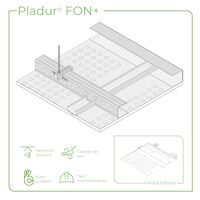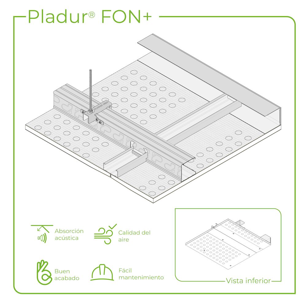 Ceiling consisting of a twin frame made from profiles installed at the same level. The primary frame of Pladur® NEO P profiles, suspended from the base structure using Pladur® NEO hanger clips and Ø 6 mm threaded rods supported on Pladur® NEO CP profiles at the perimeter. The secondary frame of Pladur® NEO S profiles assembled perpendicularly using clip joints to attach them to the primary frame in the punched core and attached to the Pladur® NEO CP perimeter profiles using Pladur® MM screws. A Pladur® FON+ board is screwed perpendicularly to the primary frame. Commensurate amounts of Pladur® materials: screws, compounds, joint tape, resilient joints, etc. Completely finished with Quality Level 2 (Q2), Level 3 (Q3), Level 4 (Q4), according to the surface finish (to be determined by the design). Justified by Technical Conformity TC-087066 certificate.