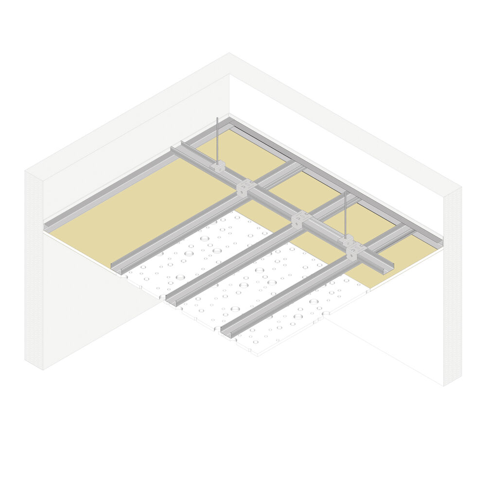 Suspended ceiling made up of a twin frame of galvanized sheet steel profiles installed at different levels (D). The primary frame is made up of Pladur® T-60 profiles hung from the framing by means of Pladur® T-60 hanger brackets and Ø 6 mm threaded rod. The secondary frame is made up of Pladur® T-60 profiles spaced 300 mm apart, hung from the primary frame by means of Pladur® T-60 hanger brackets supported around the perimeter on angular or U track profiles which are attached mechanically along their whole length. Pladur® Fon+ plasterboards are screwed perpendicularly onto the secondary frame. Commensurate amounts of anchors, hangers, hangers, screws, resilient/acoustic perimeter joints, joint compounds and tapes, etc. Completely finished with Quality Level 2 (Q2), Level 3 (Q3), Level 4 (Q4), according to the surface finish (to be determined by the design). Installed according to Pladur® recommendations, UNE 102043 Standard and CTE requirements.