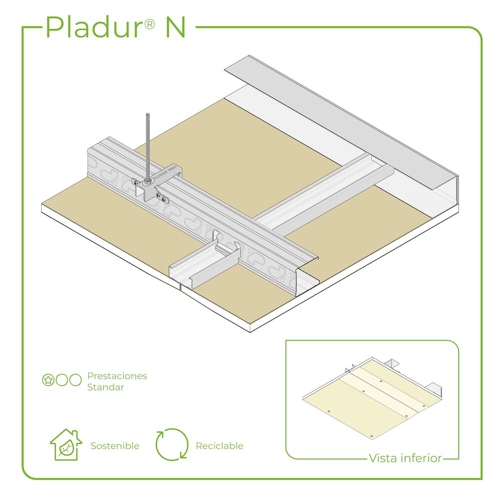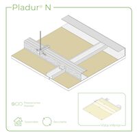 Ceiling consisting of a twin frame made from profiles installed at the same level. The primary frame of Pladur® NEO P profiles, suspended from the base structure using Pladur® NEO hanger clips and Ø 6 mm threaded rods supported on Pladur® NEO CP profiles at the perimeter. The secondary frame of Pladur® NEO S profiles assembled perpendicularly using clip joints to attach them to the primary frame in the punched core and attached to the Pladur® NEO CP perimeter profiles using Pladur® MM screws. One or two Pladur® (N, Air N, H1, F or OMNIA) board are screwed perpendicularly to the primary frame. Commensurate amounts of Pladur® materials: screws, compounds, joint tape, resilient joints, etc. Completely finished with Quality Level 2 (Q2), Level 3 (Q3), Level 4 (Q4), according to the surface finish (to be determined by the design). Justified by Technical Conformity TC-087066 certificate.