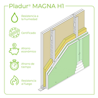 Partition made up of one or two Pladur® MAGNA plasterboards screwed to each side of a galvanized steel structure, over Pladur® studs (vertical elements) and Pladur® channels (horizontal elements). Commensurate amounts of Pladur® materials: screws, compounds, joint tape, watertight/acoustic perimeter joints, etc., as well as anchors for floor and ceiling channels, etc. Completely finished with Quality Level 1 (Q1) for tile finishes, laminates, furring, etc. Also with Level 2 (Q2), Level 3 (Q3), Level 4 (Q4), according to the surface finish (to be determined by the design). Core of the Pladur® structure filled completely with mineral wool. Installed according to Pladur® recommendations, DIT PLUS N.º 646p /20 and CTE requirements.