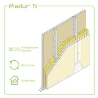 Partition made up of two Pladur® plasterboards screwed to each side of a galvanized steel structure, over Pladur® studs (vertical elements) and Pladur® channels (horizontal elements). Commensurate amounts of Pladur® materials: screws, compounds, joint tape, watertight/acoustic perimeter joints, etc., as well as anchors for floor and ceiling channels, etc. Completely finished with Quality Level 1 (Q1) for tile finishes, laminates, furring, etc. Also with Level 2 (Q2), Level 3 (Q3), Level 4 (Q4), according to the surface finish (to be determined by the design). Core of the Pladur® structure filled completely with mineral wool. Installed according to Pladur® recommendations, UNE 102043 Standard and CTE