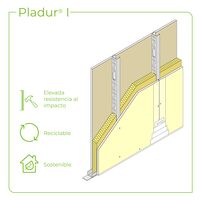 Partition made up of a Pladur® plasterboard screwed to each side of a galvanized steel structure, over Pladur® studs (vertical elements) and Pladur® channels (horizontal elements). Commensurate amounts of Pladur® materials: screws, compounds, joint tape, watertight/acoustic perimeter joints, etc., as well as anchors for channels on the floor and ceiling, etc. Completely finished with Quality Level 1 for tile finishes, laminates, furring, etc. Also with Level 2 (Q2), Level 3 (Q3), Level 4 (Q4), according to the surface finish (to be determined by the design). Core of the Pladur® structure filled completely with mineral wool. Installed according to Pladur® recommendations, UNE 102043 Standard and CTE requirements.