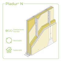 Partition made up of two Pladur® plasterboards screwed on each side to a free, twin frame of galvanised steel and set apart from each other a variable distance (minimum spacing of 10 mm + thickness of the middle plasterboard). Both structures are built on Pladur® studs (vertical elements) and Pladur® channels (horizontal elements). Commensurate amounts of Pladur® materials: screws, compounds, joint tape, resilient/acoustic perimeter joints, etc., as well as anchors for channels on the floor and ceiling, etc. Completely finished with Quality Level 1 (Q1) for tile finishes, laminates, furring, etc. Also with Level 2 (Q2), Level 3 (Q3), Level 4 (Q4), according to the surface finish (to be determined by the design). Core of each Pladur® structure filled completely with mineral wool. Installed according to Pladur® recommendations, UNE 102043 Standard and CTE requirements.