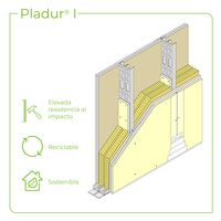 Partition made up of two Pladur® plasterboards screwed on each side of a double, braced structure of galvanized steel and spaced a minimum of 10 mm apart. Both structures are built on Pladur® studs (vertical elements) and Pladur® channels (horizontal elements). Commensurate amounts of Pladur® materials: screws, compounds, joint tape, resilient/acoustic perimeter joints, etc., as well as anchors for channels on the floor and ceiling, etc. Completely finished with Quality Level 1 (Q1) for tile finishes, laminates, furring, etc. Also with Level 2 (Q2), Level 3 (Q3), Level 4 (Q4), according to the surface finish (to be determined by the design). Core of each Pladur® structure filled completely with mineral wool. Installed according to Pladur® recommendations, UNE 102043 Standard and CTE requirements.