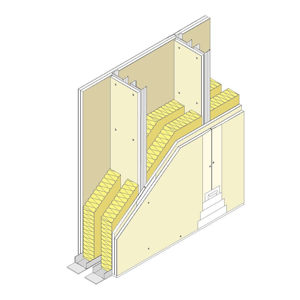 Partition made up of two Pladur® plasterboards screwed on each side to a double, braced structure of galvanised steel and set apart from each other a variable distance (minimum spacing of 10mm). Both structures are built on Pladur® studs (vertical elements) and Pladur® channels (horizontal elements). Commensurate amounts of Pladur® materials: screws, compounds, joint tape, resilient/acoustic perimeter joints, etc., as well as anchors for channels on the floor and ceiling, etc. Completely finished with Quality Level 1 for tile finishes, laminates, furring, etc. Also with Level 2 (Q2), Level 3 (Q3), Level 4 (Q4), according to the surface finish (to be determined by the design). Core of each Pladur® structure filled completely with mineral wool. Installed according to Pladur® recommendations, UNE 102043 Standard and CTE requirements.