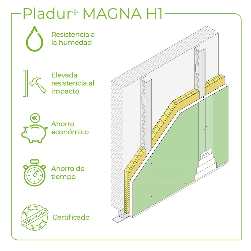 Independent lining made up of a structure of galvanised sheet steel profiles over Pladur® studs and Pladur® channels (horizontal elements), on whose interior side, depending on the height to be covered, the studs must be braced with brackets that attach to the core of the studs and the support wall, leaving a minimum space between the structure and the wall of 10 mm. On the exterior side of this structure one or two Pladur® MAGNA plasterboards are screwed on. Commensurate amounts of Pladur® materials: screws, compounds, joint tape, watertight/acoustic perimeter joints, etc., as well as anchors for channels on the floor and ceiling, etc. Completely finished with Quality Level 1 (Q1) for tile finishes, laminates, furring, etc. Also with Level 2 (Q2), Level 3 (Q3), Level 4 (Q4), according to the surface finish (to be determined by the design). Core of the Pladur® structure filled completely with mineral wool. Installed according to Pladur® recommendations, DIT 646p /20 document and CTE requirements.